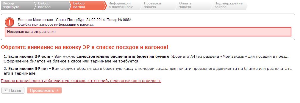 После выбора поезда из списка и нажатия "Продолжить":
