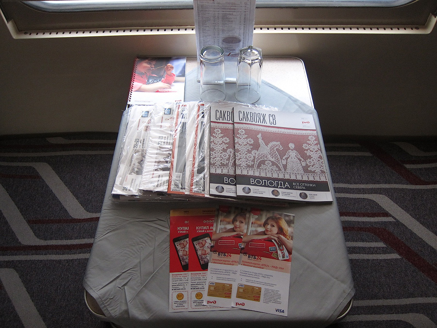 В самом вагоне всё привычно: грязновато-потёртая обивка диванов, мятая скатерть на столе, два комплекта прессы по два издания в каждом ("Российская газета", "Комсомольская правда", "Независимая газета", журнал "Профиль") + журнал "Саквояж СВ", буклеты с рекламой лотереи и книжечка с перечнем фирменных товаров ОАО ФПК