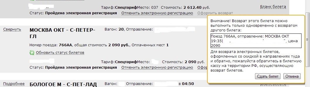 serg: Сейчас обнаружил, что появилась опция "Возврат билета" на Сапсан, купленный по тарифу "туда-обратно" (ранее она отсутствовала). Работает она или нет - не проверял, ибо нет необходимости сдавать билет.