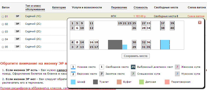 Спасибо, бьется с отчетом Ивана где 19,21,23 - одиночные. Я так понимаю что на схеме места 1-8 - лицом в спину, 9-12, 13-15, 25-28, 29-32 и, видимо 37-40 - лицом к лицу, хотя 37-40 судя по всему в продажу не идут. то есть мне надо выбирать между блоками мест 9-12, 13-15, 25-28 и 29-32. или я неправильно прикинул?Денисыч:Задайте на сайте РЖД направление СПб-Петрозаводск и посмотрите схему вагона №1 Ласточки, которая отправляется в 18:00oleg5955: Напомните пожалуйста, схема мест в премиум ласточке известна? Конкретнее - вагоны № 1,6 в № 716 Москва-СПб. Нужно взять три места так что бы хотя бы одно было по ходу движения, и, желательно не у туалета. На заповедные супер удобства не претендую :).