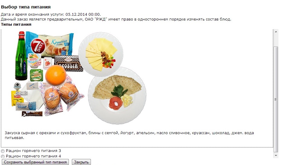 При покупке билета на сайте РЖД, предлагается выбрать один из четырех вариантов питания: