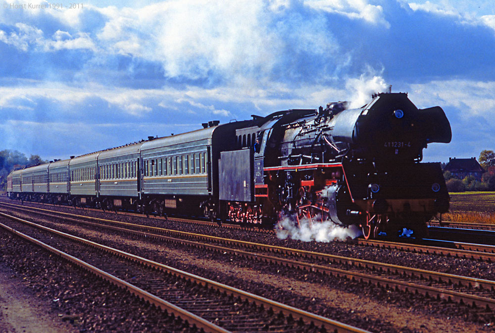 Паровоз DR DR 41 1231-4 с поездом Брест - Магдебург - Брест на станции Бург, линия Потсдам - Бранденбург - Магдебург, Германия (20 октября 1991 года):
