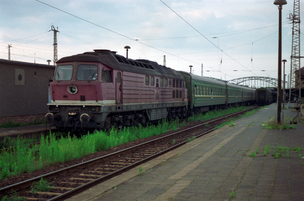 Тепловоз DR 130 077-1 с пассажирским поездом Москва - Брест - Шверин прибыл на станцию Эберсвальде, Германия (27.08.1991):