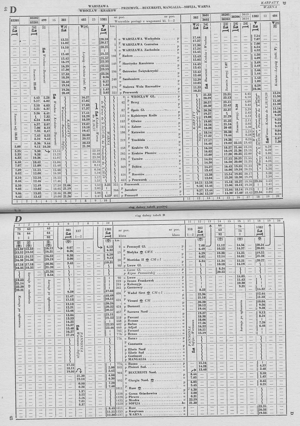 Расписание движения поездов 381/382 "Карпаты-Экспресс" сообщением Варшава - Пшемысль - Бухарест - София и 1381/1382 "Варна-Экспресс" сообщением Варшава - Пшемысль - Бухарест - Варна из международного расписания по PKP за 1985/1986 годы: