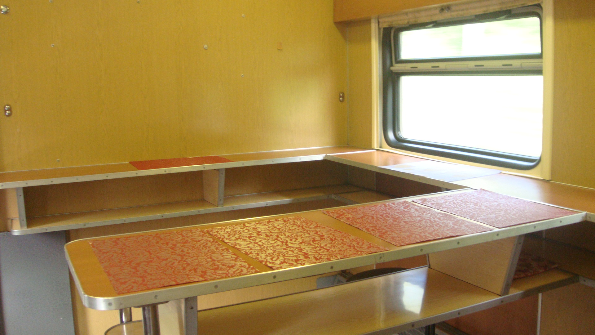 Вагон-буфет. В купейной части интерьер не обычен и совершенно не похож на родной - видимо прошёл какой-то необычный КР. К сожалению, интерьер купе запечатлеть не удалось.