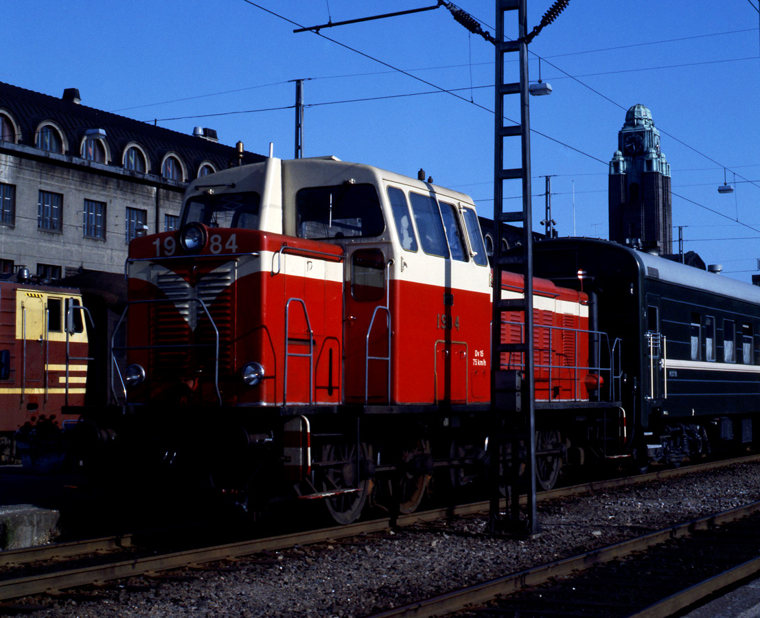 Тепловоз Dv15-1984 с составом поезда Хельсинки - Ленинград на станции Хельсинки, Финляндия (1979-й год):