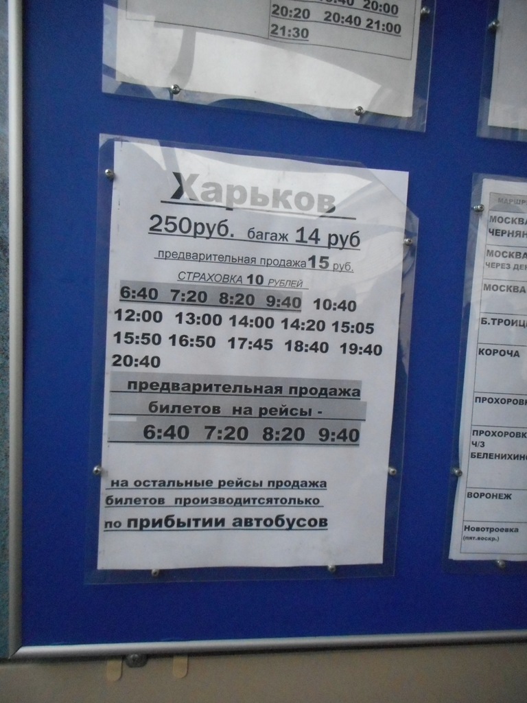 не совсем ж.д перевозки, но тем, кто избегает межгоса может пригодится - расписание автобусов Белгород - Харьков вчерашней свежести и общий вид автостанции Южного направления (слева ж.д вокзал)