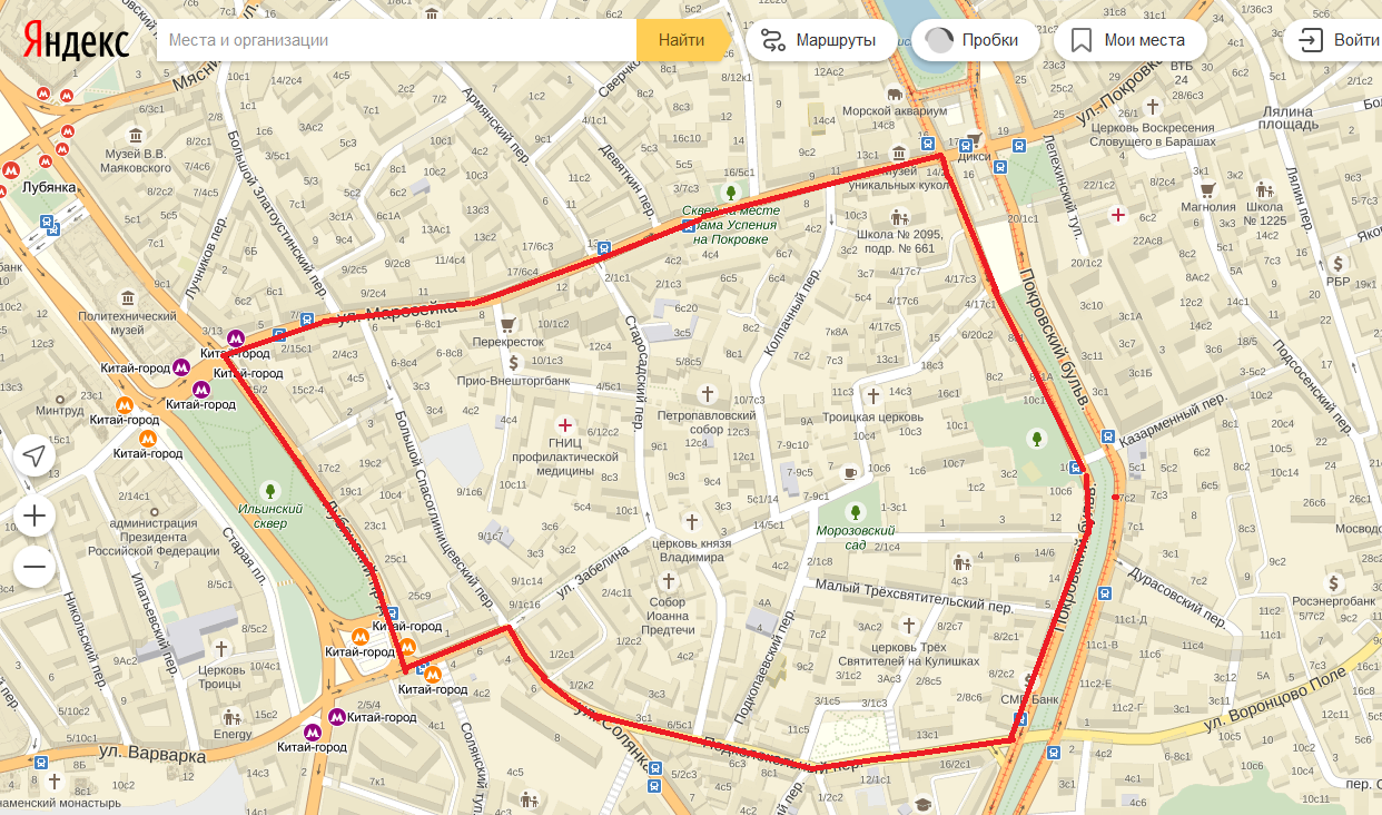 В конце вы выйдете к площади Яузские ворота, там можно проехать на трамвае до Чистых Прудов и далее обратно к Трём Вокзалам, либо до Чистых прудов пройтись пешком по бульварам. В некоторые переулки я составил маршрут с разворотами, в принципе если 7,31 км до Яузских ворот выдержите, то эти переулки (вроде Большого Спасоглинищевского) тоже стоит посетить. Я вот сам от Трёх Вокзалов пешком дошёл до м. Октябрьская (как раз по всем этим переулком плутал, там точно километраж за десятку будет) :;-):