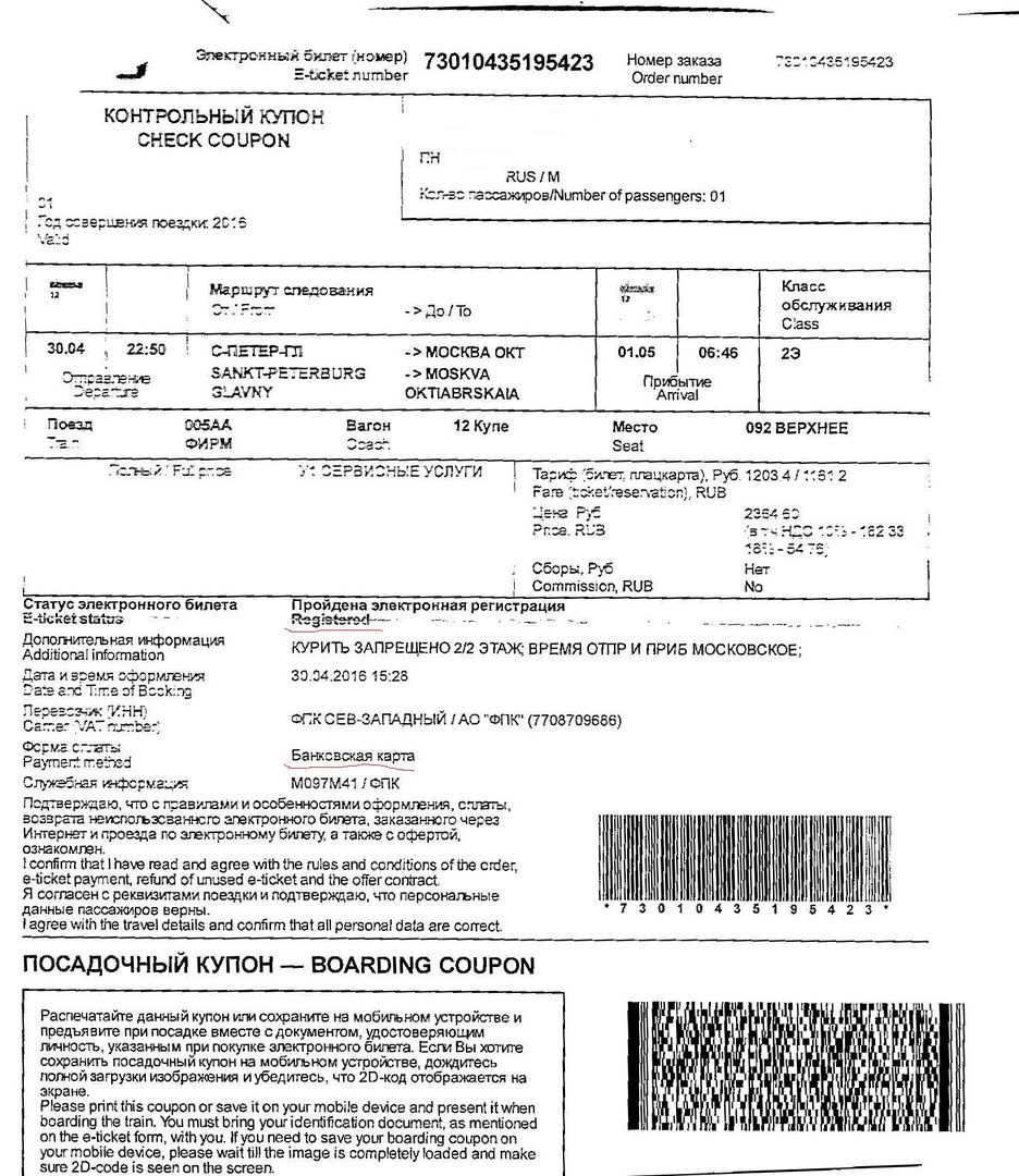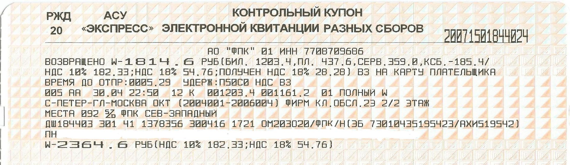 Ну и наконец крепкий орешек. Эту квитанцию получил в кассе возврата Витебского вокзала. Будучи посланным кассиром подальше, мол, не моё дело знать технологию возврата денег. Как видим, ключевое слово - "возвращено на банк. карту", хотя повторяться уже нет смысла. деньги ушли