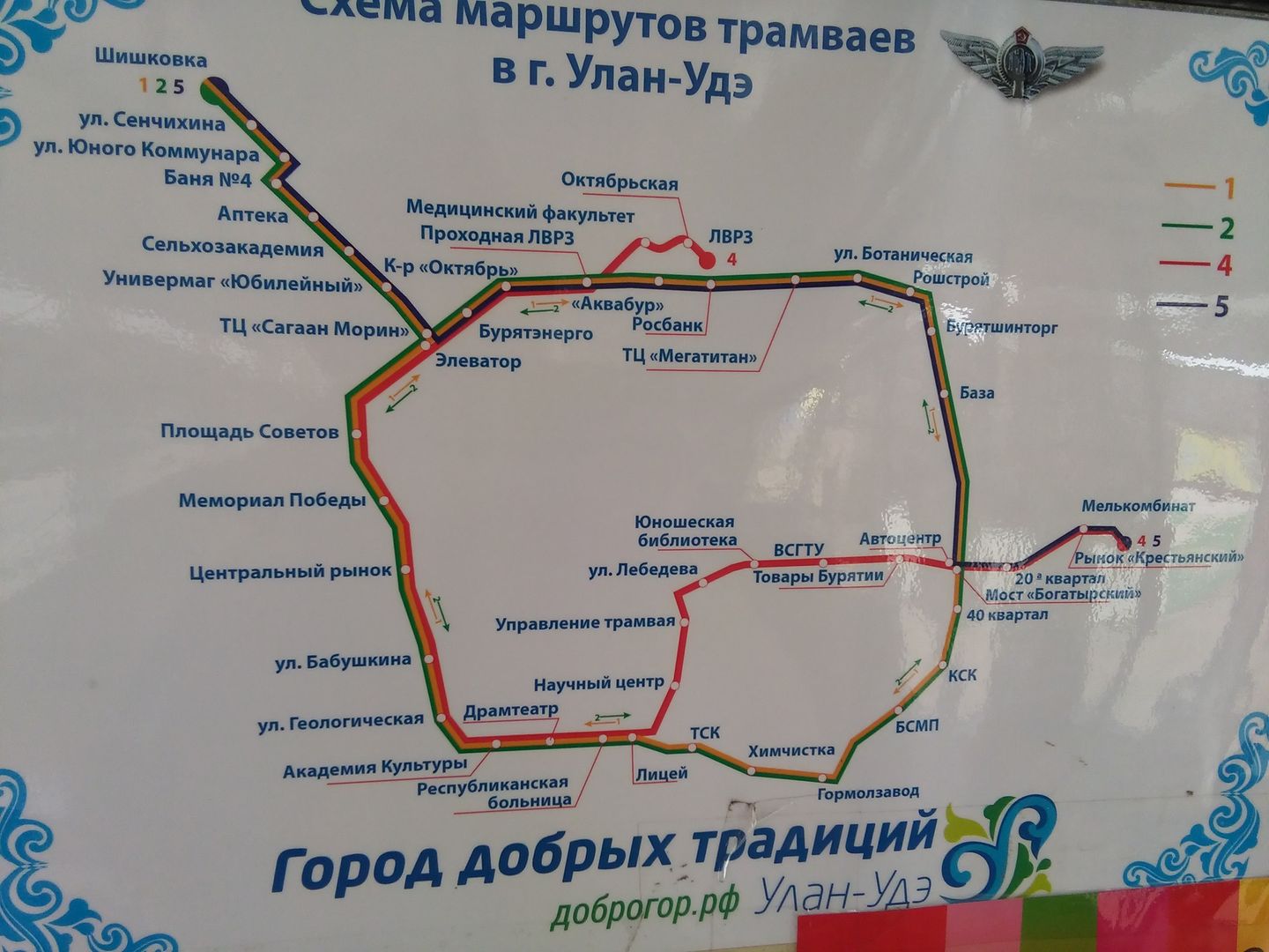 В Улан-Удэ нет привычного для жителей Читы троллейбуса, зато есть трамвай. Система открыта ещё в 1958 году, а современные очертания приобрела уже к 1989 году. Маршрутов 4, один из них петлевой - отличный вариант для обзора города. Схема из вагона: