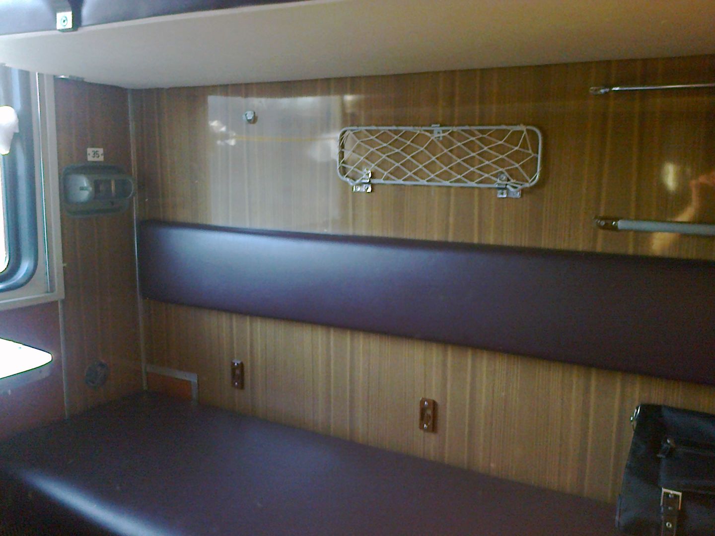 Вагон похож на тот, что на фото, не знаю, как описать. В купе с одной стороны выдвижная лестница, а между верхней полкой и стенкой пространство для одежды. Плюс, такие полочки-корзиночки (с высокими бортиками), удобно. В купе имеется розетка.