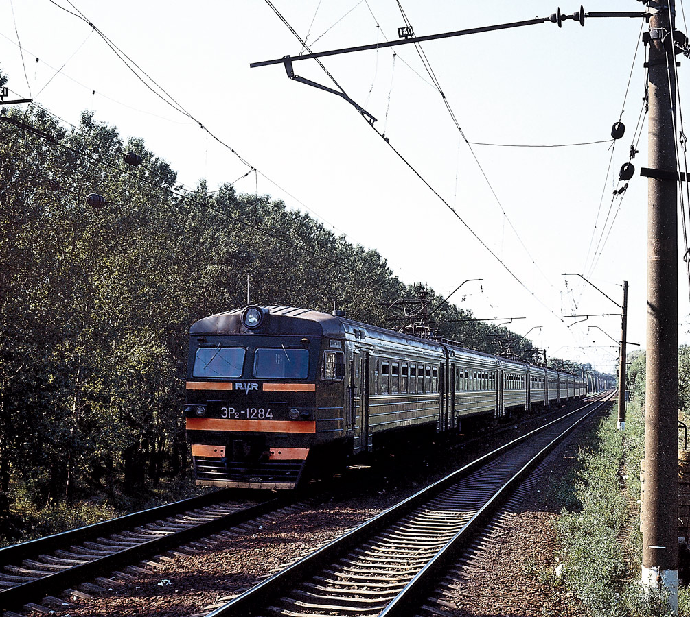Электровоз ЧС2-757 с пассажирским поездом на станции Поварово-III, Московская область (2 сентября 1998 года):
