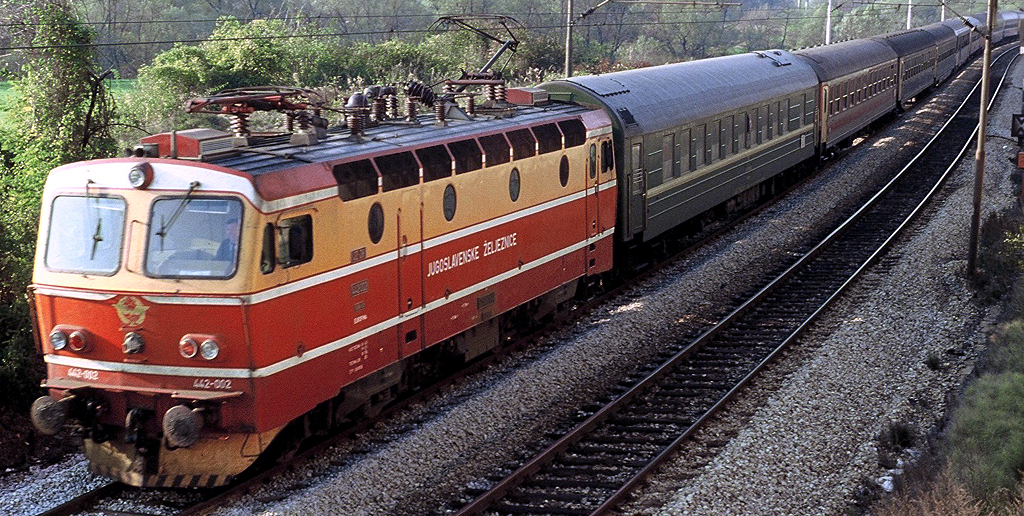 Электровоз JZ 442-002 с поездом № 221 "Simplon Express" Париж - Милан - Венеция - Загреб - Белград и прицепным вагоном SZD сообщением Рим - Москва (фото с настенного календаря за 1991-й год):