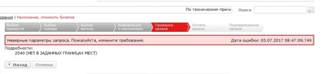 Не-а, проблема не в этом. Ждала и 10 и больше минут. После того как уже купила билет на новом сайте, то провела маленький эксперимент. Снова дошла на старом сайте до покупки при выборе свободных мест (параллельно был открыт новый сайт, но без регистрации и резервирования мест, чтобы видеть свободны ли места) и произошла аналогичная картина, т.е. ошибка "что в диапазоне нет свободных мест". Попробовала на плацкарте, там все проходит и выходит на оплату. Что-то у них сбоит на данном вагоне.