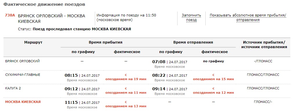 738 прибыл с опозданием на Москву-Киевскую на 13 минут, поезд прибыл в Сухиничи с опозданием в 19 минут.