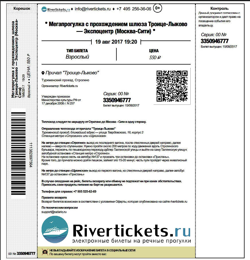 Ну а поскольку данная поездка в Москву очень удачно совпадала по срокам с речной навигацией, то и решение о поездке на теплоходе было принято заранее. На сайте Rivertickets.ru был приобретен электронный билет на теплоход «Амстердам» (Москвич), по маршруту причал Троице-Лыково – Экспо центр «Москва-систи», с прохождением шлюза №9 Карамышловского гидроузла. Отправление из Троице-Лыково в 19 часов 20 минут. Вот сам билет (фото)