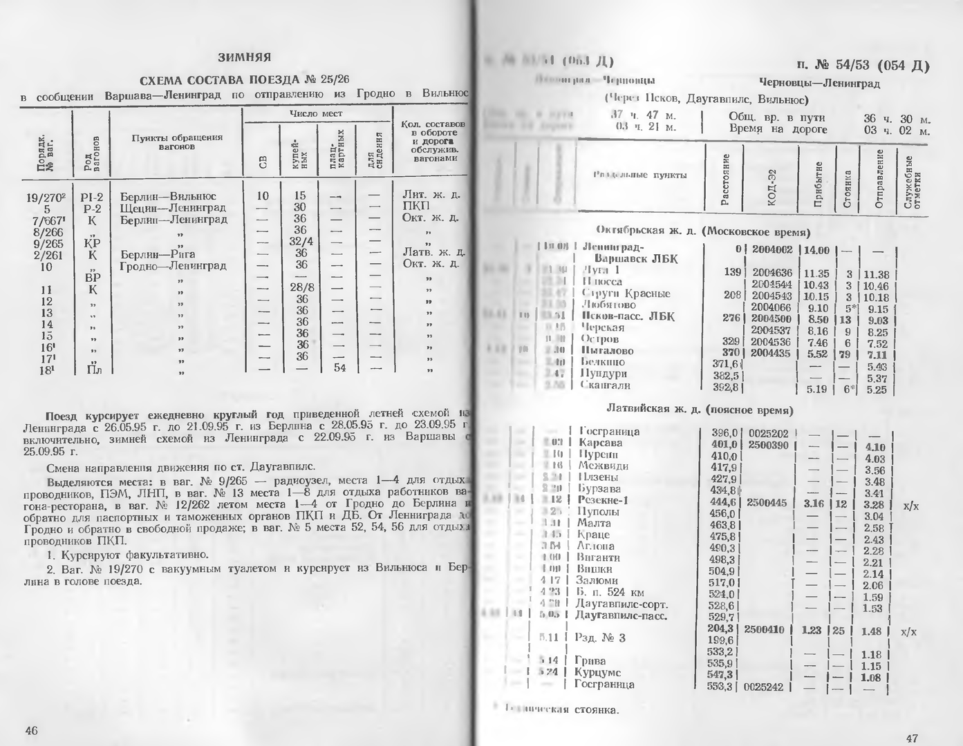 - из служебки ЛДЗ за 1995-96 годы (кстати, ещё на русском). Поезда №№ 11/12 в этой книжке нет от слова "совсем". Международка представлена поездами №№ 7/8 Таллинн - Шештокай, 25/26 Петербург - Берлин и 53/54 Петербург - Черновцы/София. Всё.