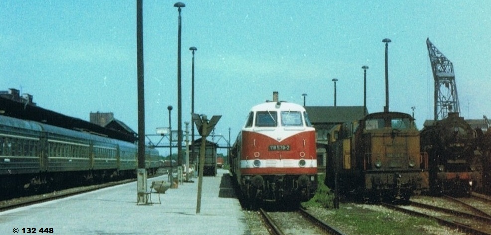 1986 gab es auf der Strecke von Schwerin nach Plate und zurück ein sehr interessantes Zugpaar. Wegen Platzmangel in Schwerin wurde der Zug Moskau - Schwerin - Moskau tagsüber in Plate abgestellt. Dieser Zug verkehrte damals ausschließlich für Angehörige der sowjetischen Streitkräfte. Am 19.06.1986 bringt 118 117-1 vom Bw Schwerin den Zug von Plate nach Schwerin.