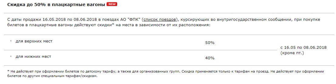 С даты продажи 16 мая 2018 по 8 июня 2018 действует скидка* к тарифам на проезд в общих вагонах, вагонах с местами для сидениях скорых и пассажирских поездов АО "ФПК" во внутригосударственном сообщении. 40% с 16.05 по 31.08.2018 (кроме пятниц и 09, 12.06.2018)