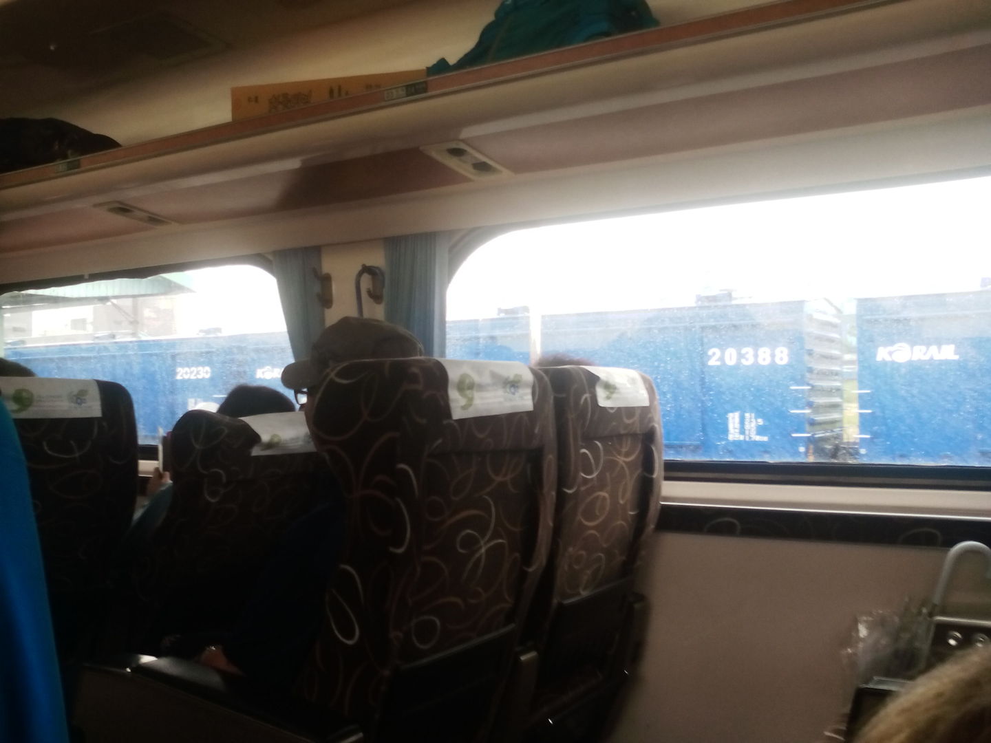 Вагон - сидячий, как и практически все поезда в Корее. Расположение кресел 2+2, все сидения лицом по ходу движения. кресла очень большие, как и интервал между рядами, раньше такого простора нигде мне не встречалось, спинки опускаются на значительный угол, также выдвигаются оттоманки, получается практически горизонтальная поверхность. Столики выдвигаются не из спинок впереди стоящих кресел - а из подлокотников, интересная там такая кинематика, но получается в итоге немного хлипковато.