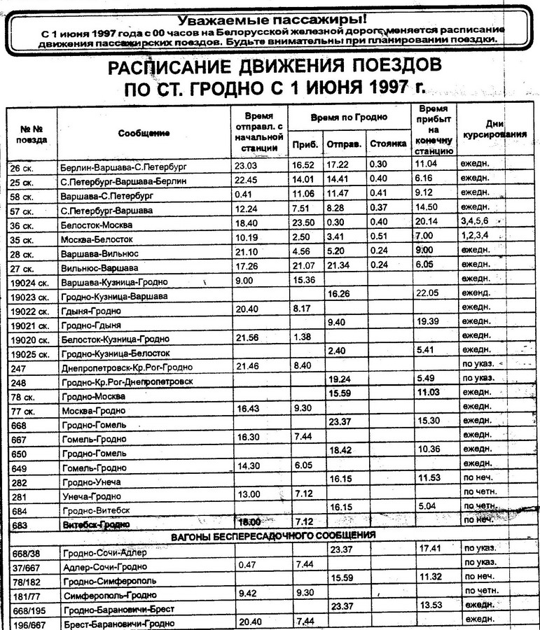 Гродно - Унеча - это хорошоSM@TRON: Расписание по станции Гродно за 1997 год.