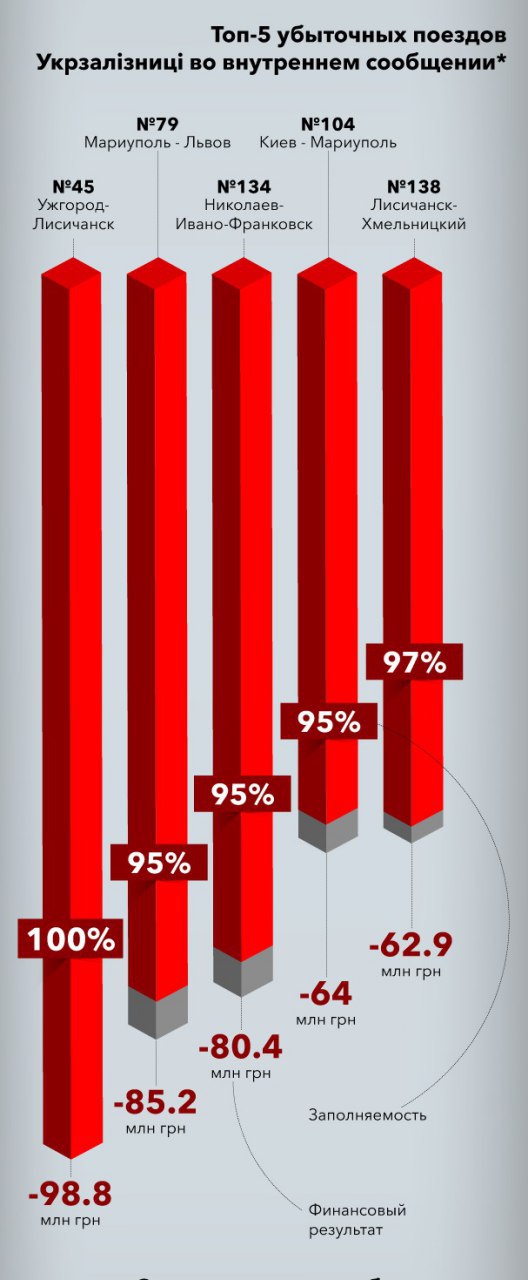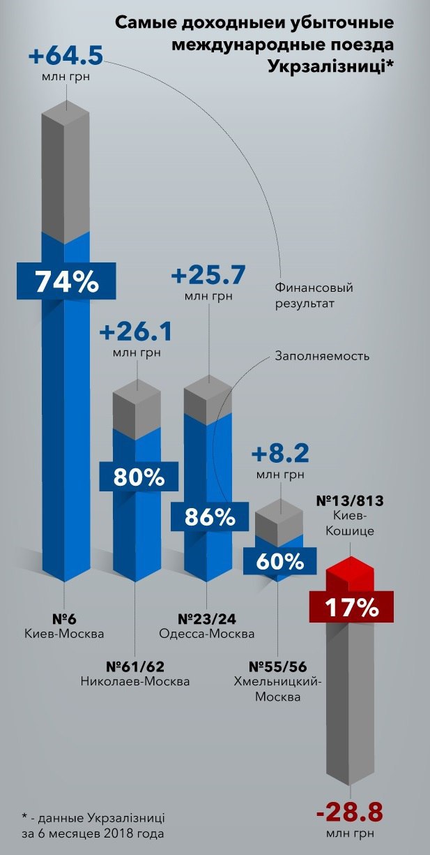 Убытки УЗ от пассажирских перевозок за 2017 г.-$360 млн,из них $150 млн - поезда дальнего следования. Один поезд Киев-Москва приносит больше выручки, чем 5 прибыльных внутренних маршрута вместе взятых