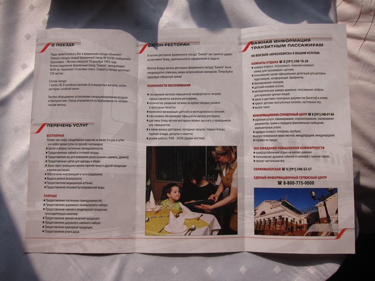 7. Соответствие поезда статусу фирменного: по качеству обслуживания и новизне вагонов соответствует полностью, единственный минус - полное отстутствие вагонов повышенной комфортности (вагонов с услугами) - нет ни ЛЮКС 1Б, ни КУПЕ 2Э. По определенным числам к поезду ставят прицепку "Сибиряк" Москва-Новосибирск. Там есть один (иногда 2) вагона КУПЕ 2Э (повышенной комфортности), СВ с услугами все равно нет, но это уже другой фирменный поезд.