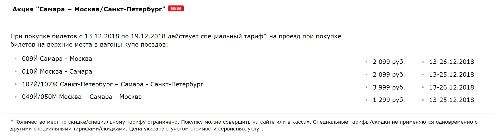При покупке билетов с 14.12.2018 по 28.12.2018 действует скидка 50% на проезд на верхних местах вагонов купе на отдельные даты отправления следующих поездов: