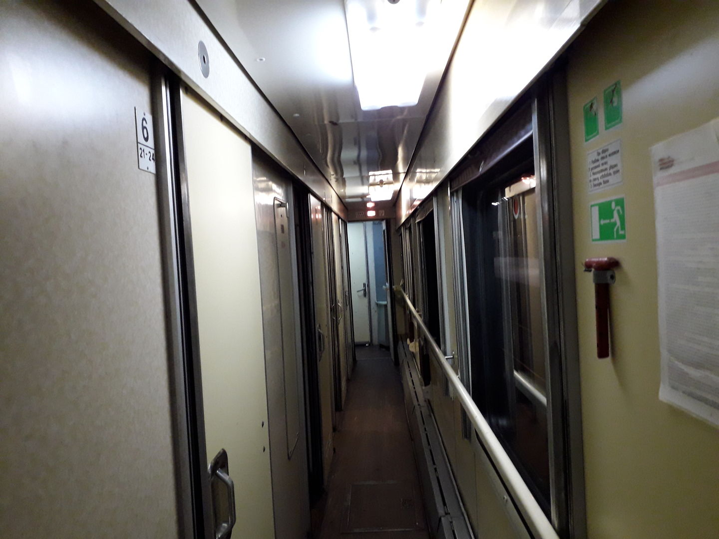 Внутри, как ни странно, вполне нормальный "ламповый" вагон, чисто, но местами с пылью. В купе коврик, в коридоре нет. Постельное белье уже лежало, поэтому расстелились. Не обрадовали подушки "для дюймовочек" и простыня с неотстиравшимися пятнами от сажи. Температурный режим комфортный, засыпал при +22, просыпался под +25. Из окон не дуло. Туалеты в меру ушатанные в силу срока службы вагона, но все необходимые аксессуары на месте, горячей воды нет.
