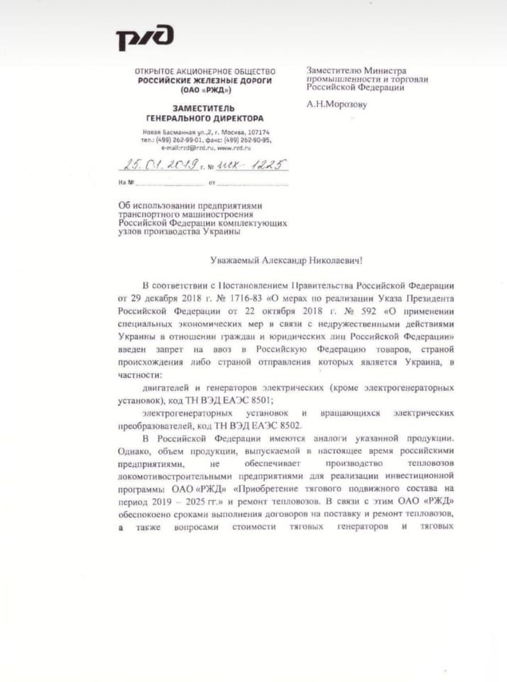 И вот эти «запросы» прозвучали. Как сообщает украинская пресса со ссылкой на «Белорусскую правду», замгендира РЖД Кобзев просит замглавы Минпромторга РФ Морозова посодействовать в отмене запрета на приобретение украинских двигателей и генераторов для производства и ремонта локомотивов.