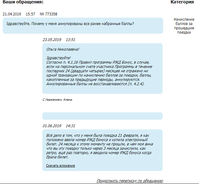 у подруги аннулировали 16572 баллов, 4572 балла она сама накатала, а 12000 в интернете купила 3 апреля 2017 года, но никуда не поехала,баллы её аннулировали спустя 24 месяца, последняя запись о поездке была на счете от 20 марта 2017 года, баллы аннулировали 21 марта 2019 года, но 21 февраля 2019г она ездила на ПДС, купила билет, номер РЖД Бонус указала верно, (иначе бы билет не купился), но ей сразу не засчитали это поездку, а только 21 апреля зачислили как ретро поезду.