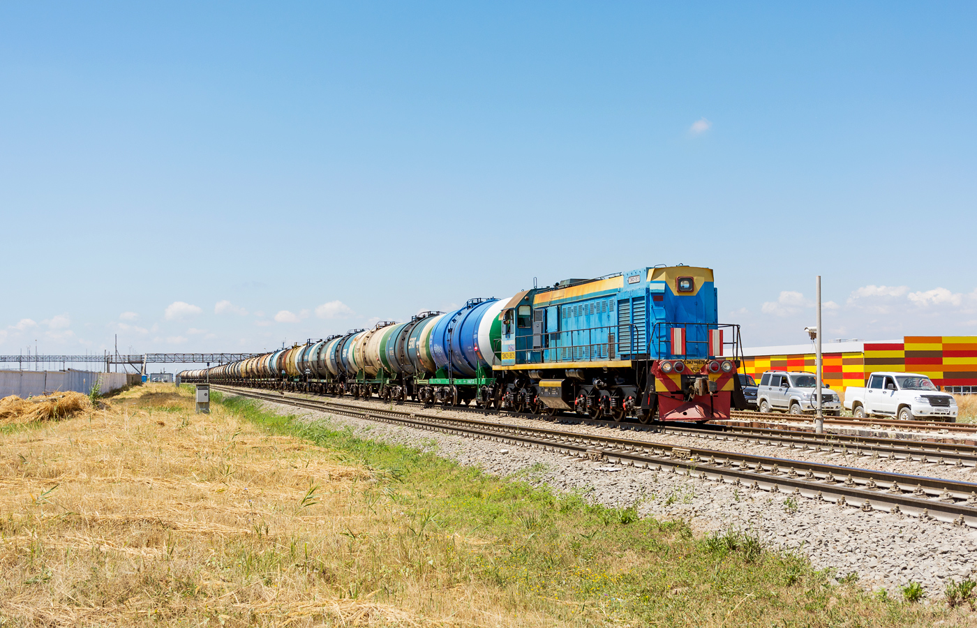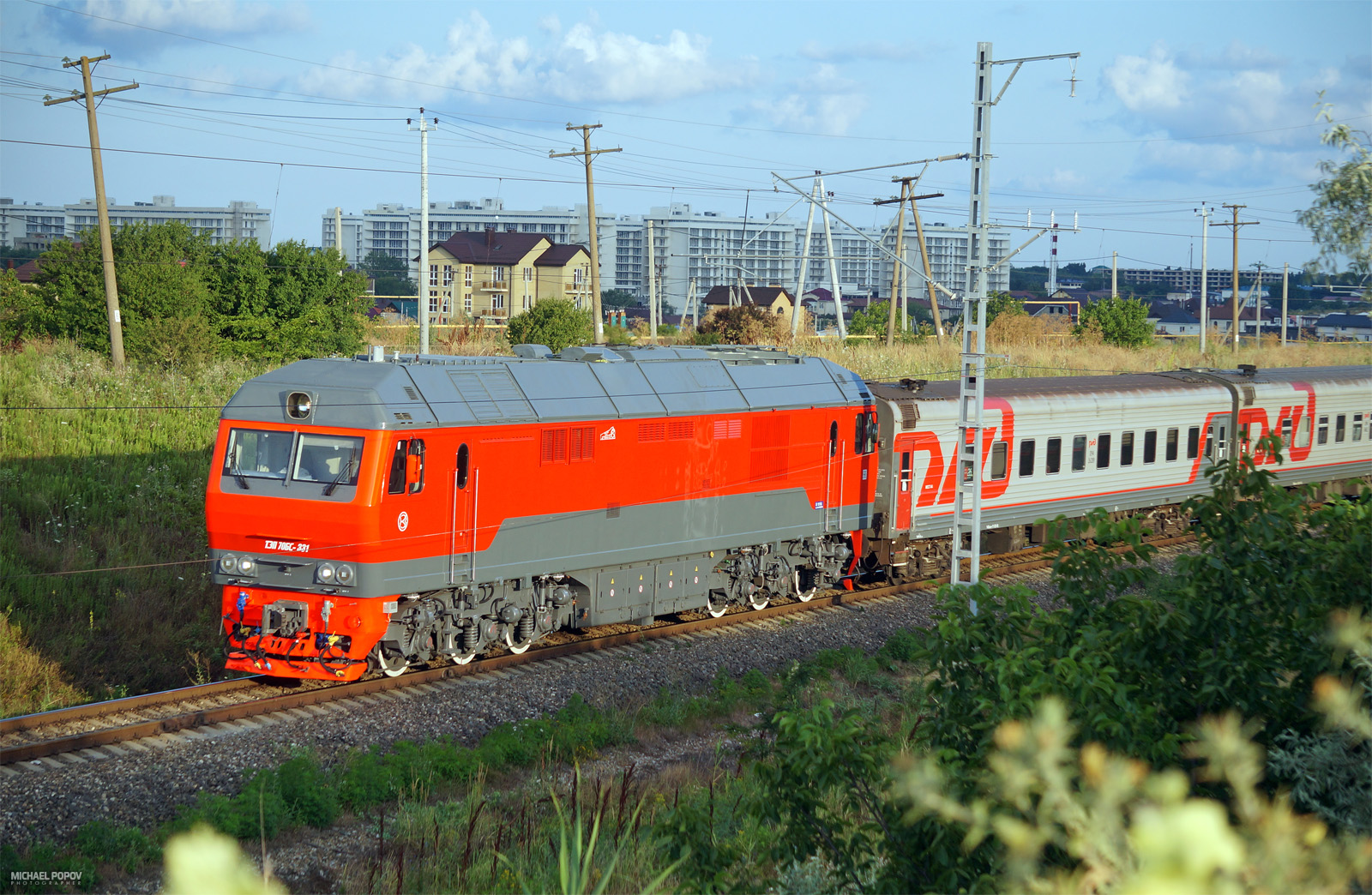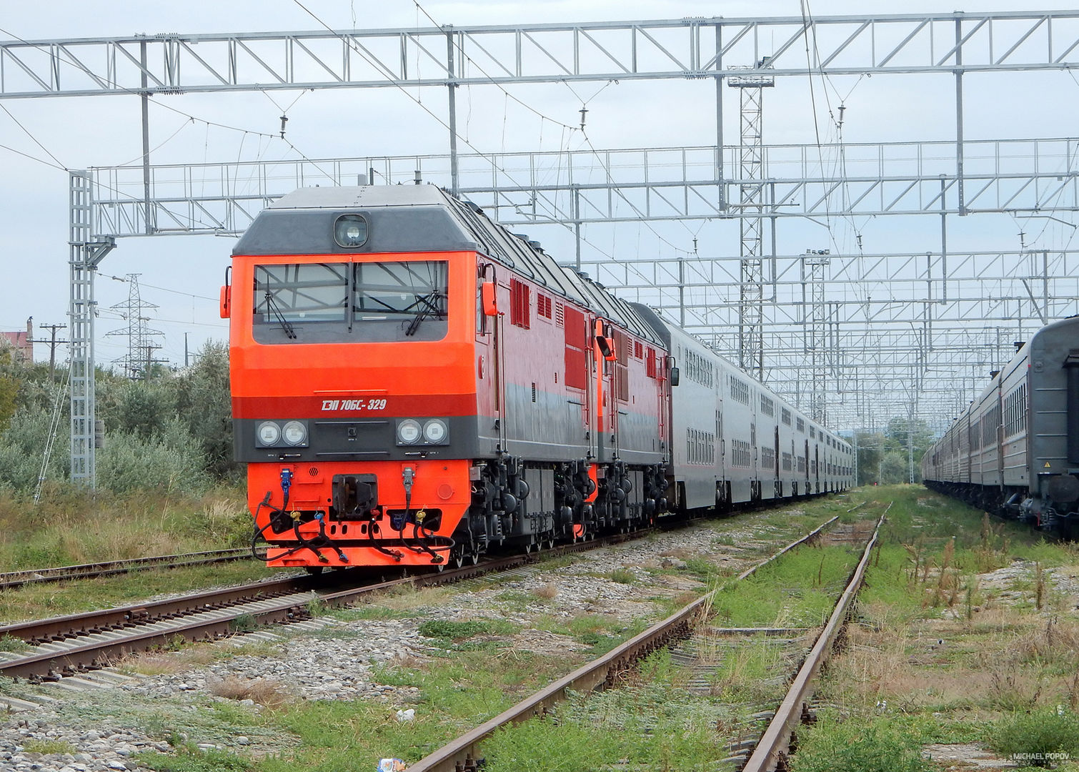 Тепловозы ТЭП70БС в серо-красно-оранжевой ливрее на Анапских жд. просторах. Июль 2019 г.