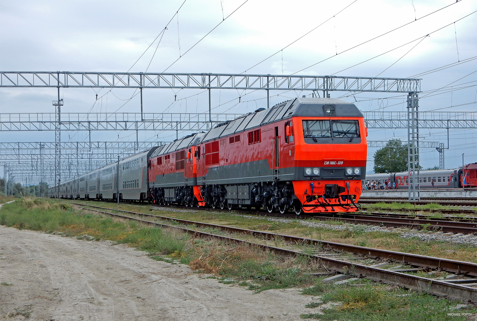 ТЭП70БС-336 и ТЭП70БС-335 с двухэтажным поездом № 27 Анапа-Москва, станция Анапа, июль 2019 г.