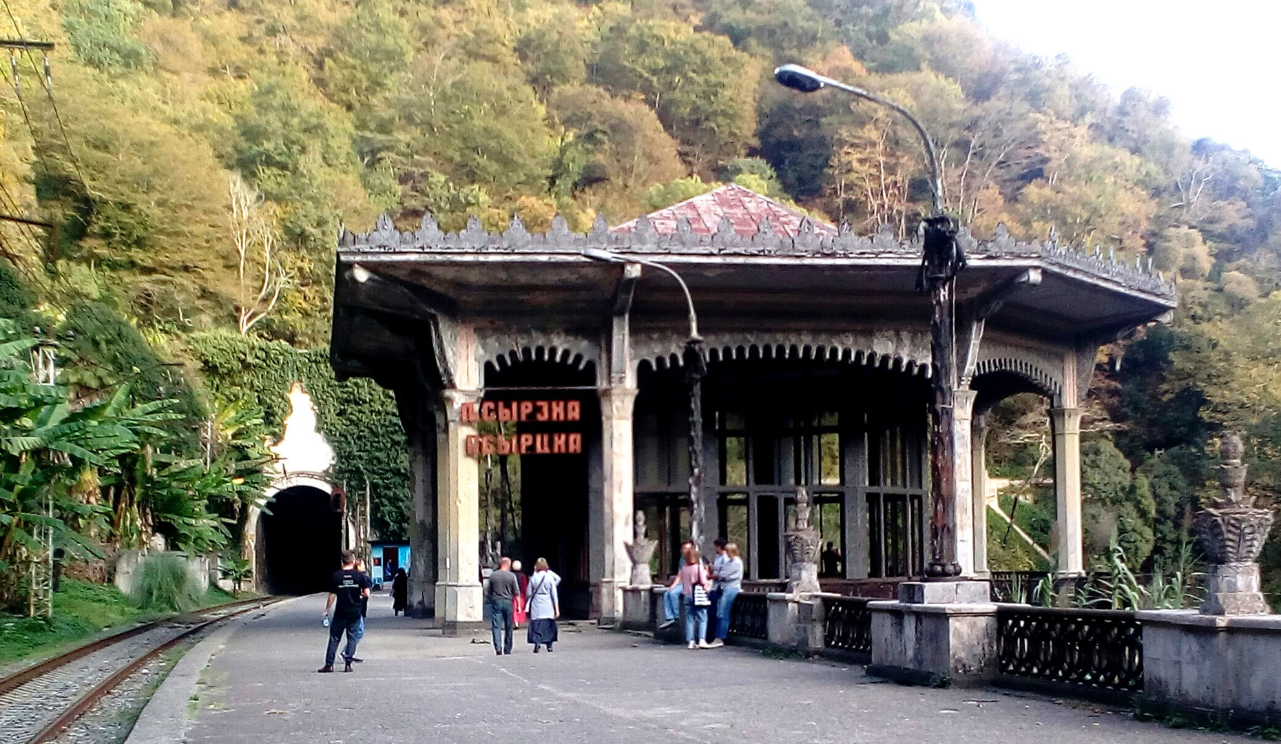 Железнодорожный вокзал располагается в периферийной, не особо привлекательной для туристов части Нового Афона