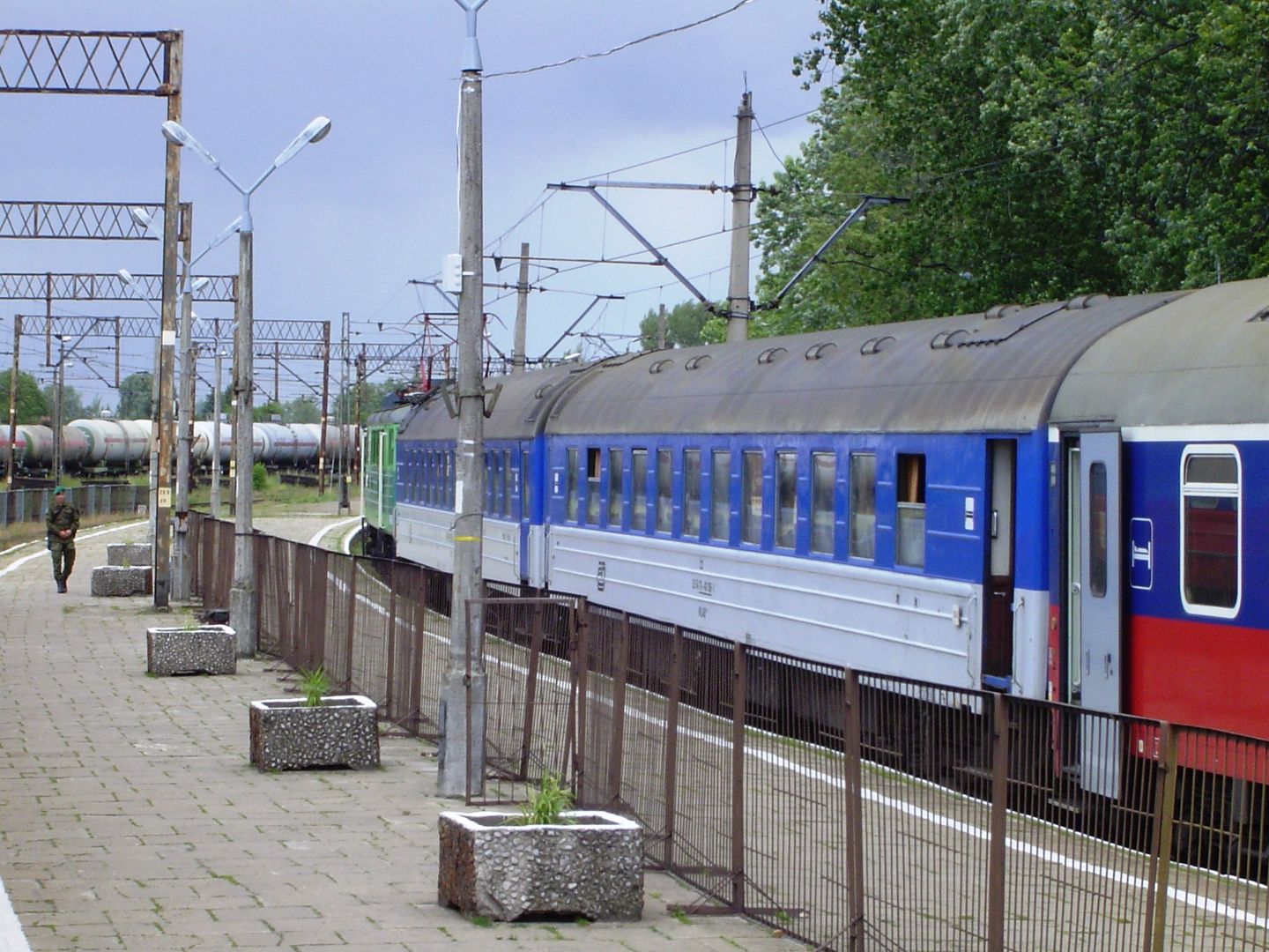 Damals wars... Terespol, blick vom "Ost-West-Express" (Moskwa-Belorusskaja - Warszawa Wsch.) auf den "Vltava" (Praha hl.n - Moskwa-Belorusskaja), 17.06.2004.