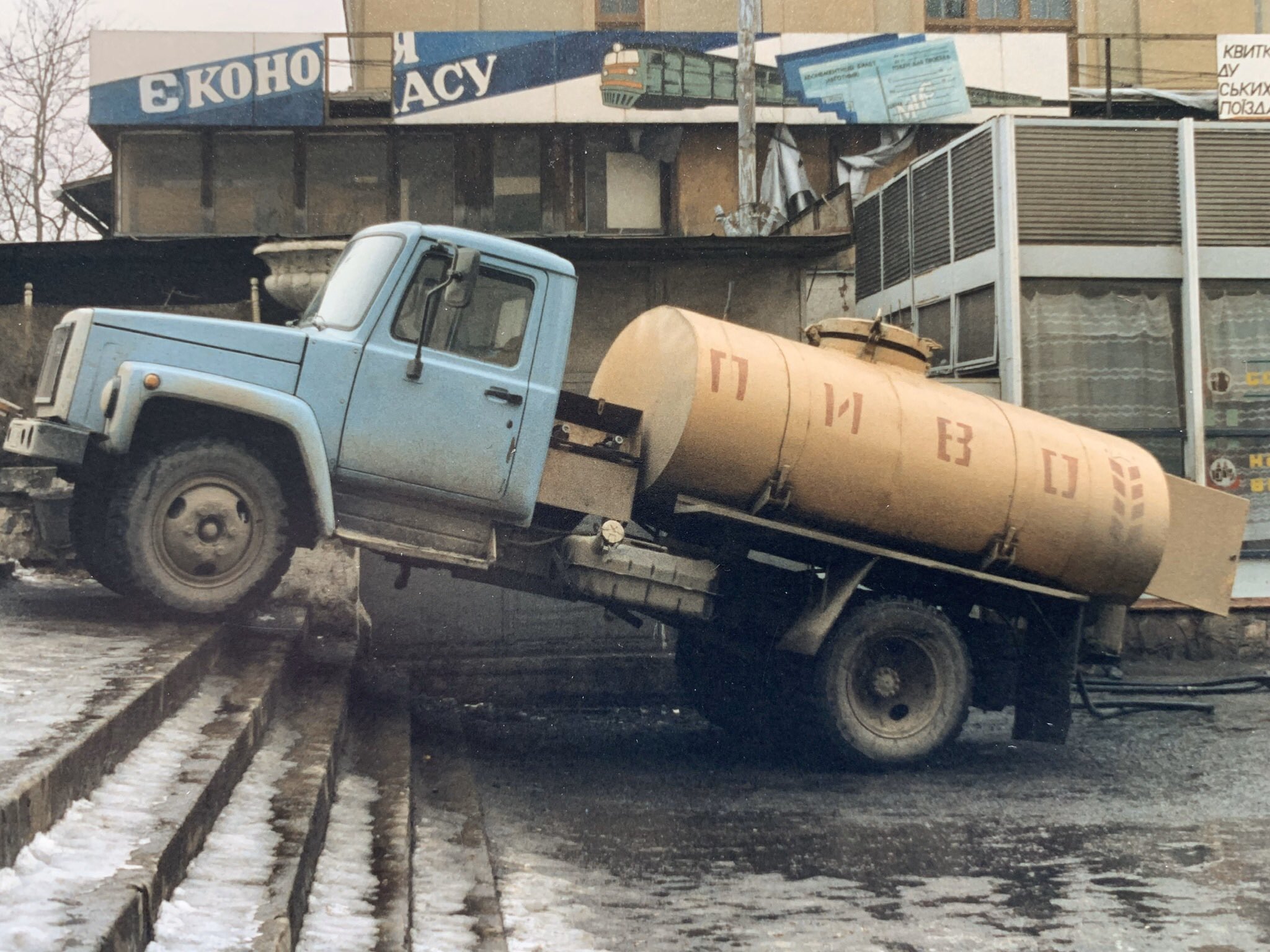 Februar 1992: ТИССА / Tisza-Express im Bahnhof Lviv. Unterhaltung und Geträke vorhanden.