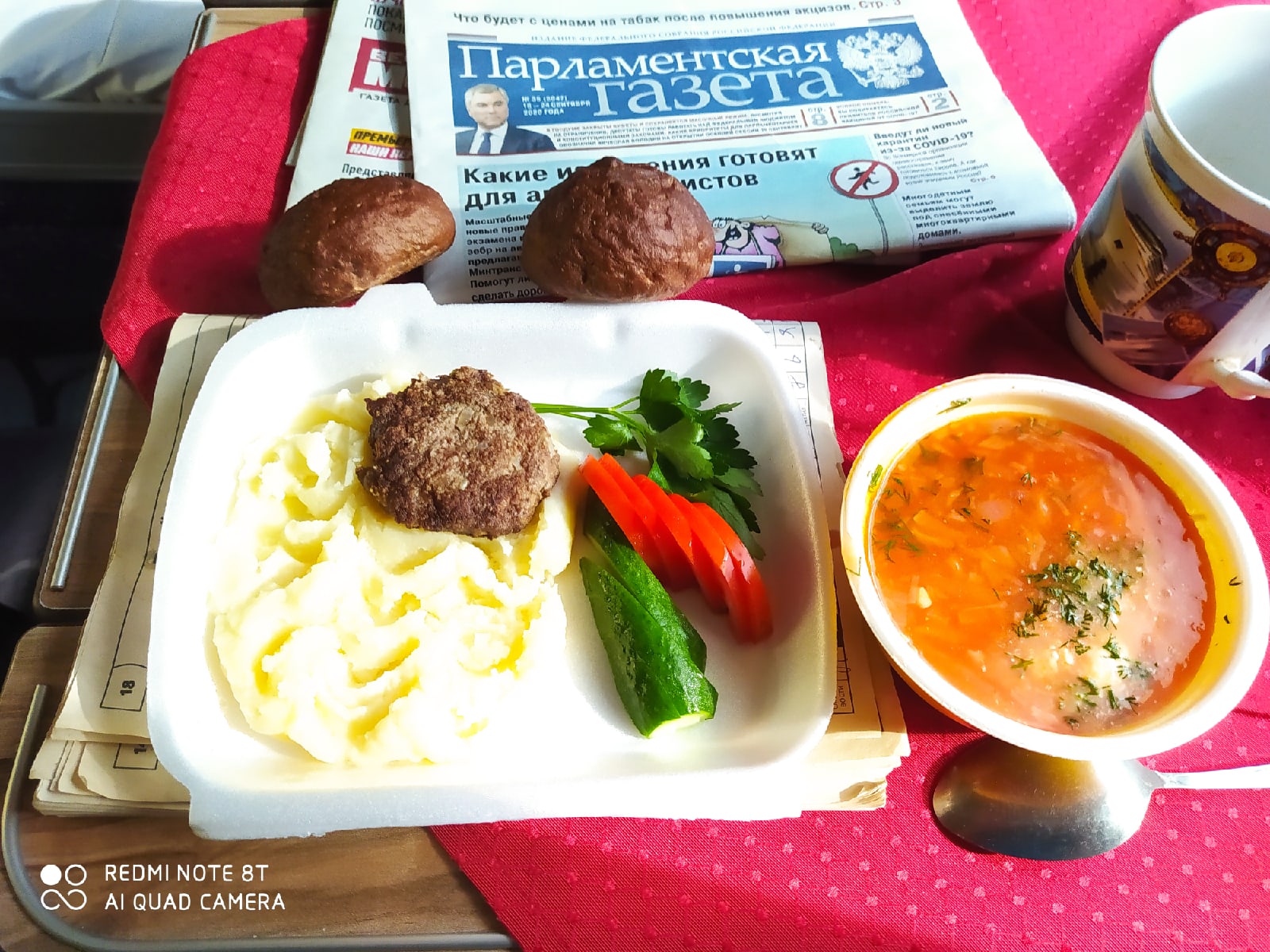 Утром носили выпечку. Офигенные пироги с красной рыбой и картошкой (начинки много, рыба и картошка 50/50%) и сосиски в тесте. Взял и то и другое. Заказал на пробу обед - борщ, салат, картошку с котлетой.