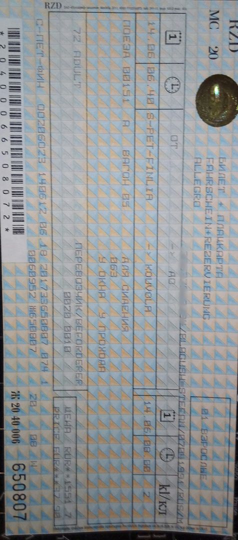 Кроме билета на международный поезд, так же попросил распечатать билет на поезд по РФ. Удивило то, что билет "старого" образца теперь без отрывного / контрольного купона. Сначала подумал что кассир случайно оторвала его, но нет, как выяснилось "старые" бланки сейчас без контрольных купонов.