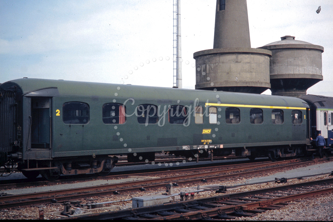 GHT1244 - France SNCF class coach at Calais Maritime station (08.04.1983) - Express nord "baloon" coach - G.H.Taylor.