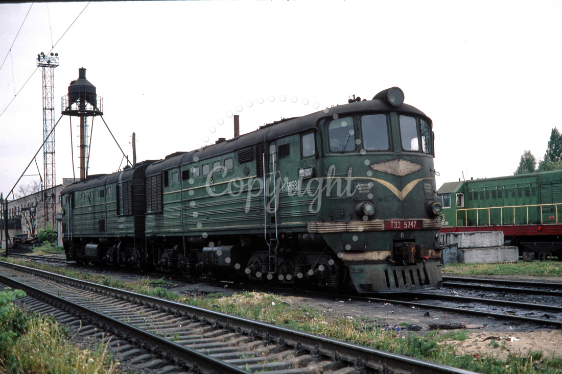 JMT8387 - Russian SZD class TE3-5247 on shed at the Shepetovka station (25.05.1992) - John Tolson.