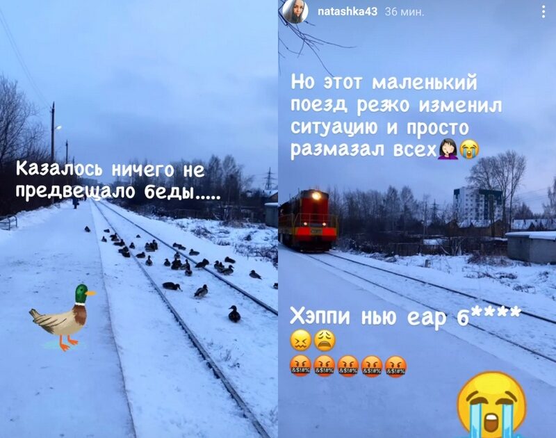 Утки сами виноваты: нарушили правила нахождения на путях и не реагировали на предупредительные сигналы.LmV » 03-01-2021, 14:30:В природохранную прокуратуру. И пусть машинист съест этих уток, прямо на глазах у прокурора.