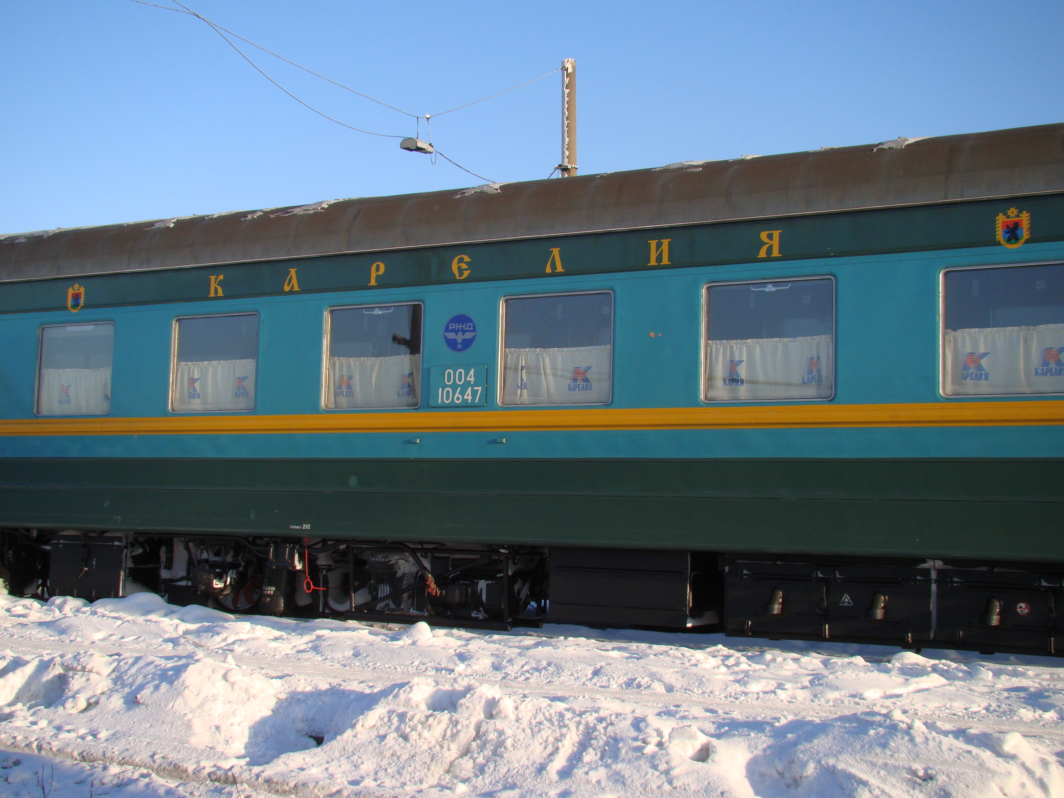 купейный вагон № 004 10647 фото 18.01.2010 года (штор нет возможно потому, что вагон на момент съемки не в основном составе, а на подмене) (то, что не видно в кадре - на кузове уже нет эмблемы "ОМ" на последнем по коридорной стороне межоконном промежутке):