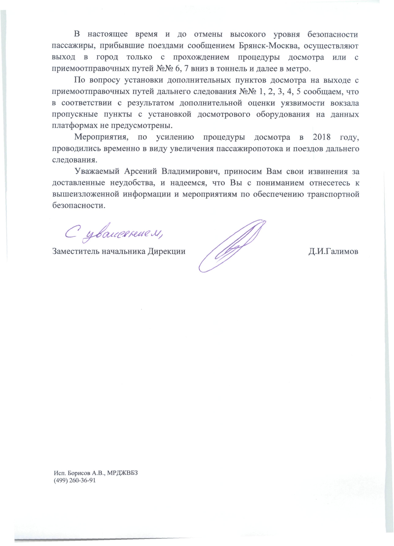 После приезда в Брянск мною было отправлено обращение в РЖД (к слову, многие так же не довольны, в том числе и известный в нашем городе и Москве ведущий Сергей Зайцев, который часто и катается в Москву нашими экспрессами) по поводу образования очередей на досмотр, с просьбой или увеличить досмотровые зоны и поставить дополнительные комплексы, как это было летом 18 года во время ЧМ, или же разрешить, как раньше, пассажирам выходить в город не через здание вокзала с досмотром, а через платформу 5 пути и ворота. Вчера вечером пришел ответ, если кратко