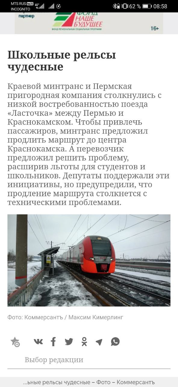 Завтра открывается движение электричек Пермь-2 - Пермь-1.
