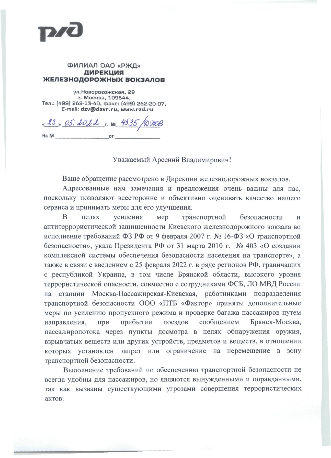 После приезда в Брянск мною было отправлено обращение в РЖД (к слову, многие так же не довольны, в том числе и известный в нашем городе и Москве ведущий Сергей Зайцев, который часто и катается в Москву нашими экспрессами) по поводу образования очередей на досмотр, с просьбой или увеличить досмотровые зоны и поставить дополнительные комплексы, как это было летом 18 года во время ЧМ, или же разрешить, как раньше, пассажирам выходить в город не через здание вокзала с досмотром, а через платформу 5 пути и ворота. Вчера вечером пришел ответ, если кратко