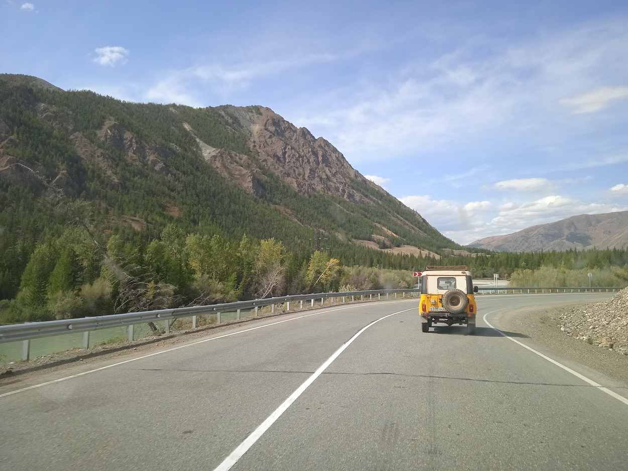 Утром рано пошел из гостиницы в направлении выезда из города, и напротив одного магазина увидел, как казахи пакуют вещи и рассаживаются в 3 микроавтобуса. Подошел к ним, они сообщили что едут в Астану и довезут меня до Кош-Агача, за 2000 рублей. Торговаться было неуместно, да и все складывалось по плану и по времени. Через полчаса машины тронулись, и к 8.00 мы приехали к закрытой границе, работает с 9.00, это был понедельник. Впереди стояло 45 машин, почти все с Монгольскими номерами, редко с казахскими. И справа за поселком была очередь из новых тягачей и новых транзитных иномарок, следовавших в Киргизию на растаможку и далее в Россию. (Л- логистика). Открылась граница, много машин сразу поехало под шлагбаумы, очередь заметно продвинулась. Меня пересадили в другую машину, которая следовала в Кош-Агач, но находилась уже под шлагбаумом. На границе Монголии про другой штамп не спросили, на российской границе сотрудник РСН спросил как я себя чувствую), а погранец спросил откуда именно я из Белгородской области - он сам оказался из Курска. Через минут 40 меня высадили возле супермаркета Мария Ра и я сразу нашел в группе ВК попутку до Горного за 1400 рублей. Ехал впереди, слева. Останавливались покушать на повороте на Белуху. Пейзаж менялся от пустынного до горного и лесистого. Ближе к Горному пошел дождь. Перед закатом приехал в Горно Алтайск, заселился в гостиницу в центре, фасад был на ремонте. В запасе был еще один день до вылета, на следующий день сгонял в Чемал, но и там дождь застал. из Чемала сделал остановку в Манжероке возле остановки автобуса, а на горе работа идет, Сбербанк устанавливает канатки и расчищает полосы. Вернулся в Горный, утром вылетел в Домодедово, успел на электричку.