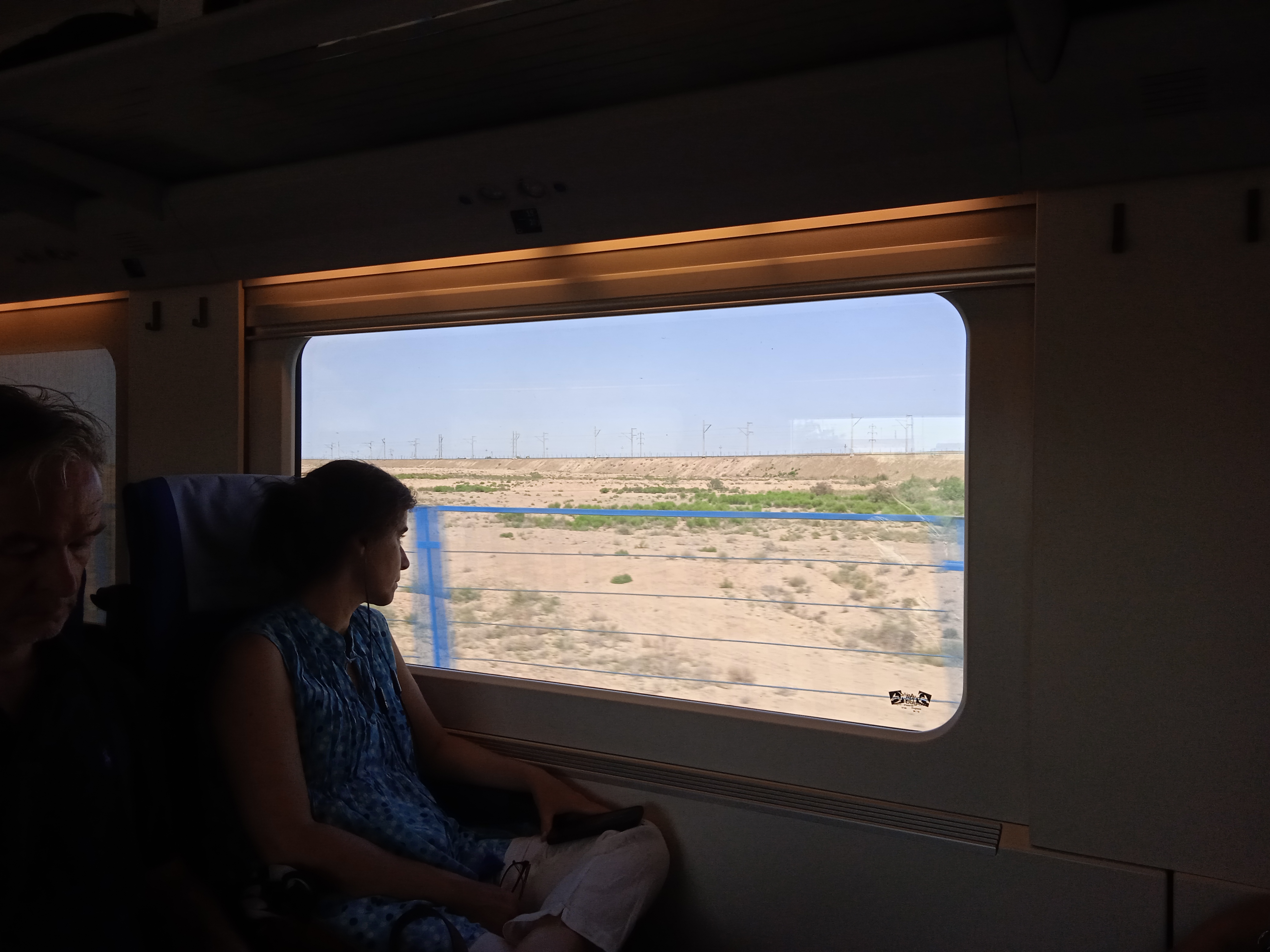Городских фотографий Бухары полно в интернете, так что опустим. Станция находится примерно в 10-12 км от города, ночью ехали на такси (30 или 35 тыс, не помню), днем на автобусе, много народу было. Предстоял дневной путь из Бухары в Самарканд на Афросиебе. Обратил внимание, что в этот раз я его не фоткал, а фоткала жена. Скоростная сидячка. Я почему-то просчитался, когда заказывал места у наших партнеров в Узбекистане и в итоге у нас были места по ходу движения, но напротив кресла были "в лицо".