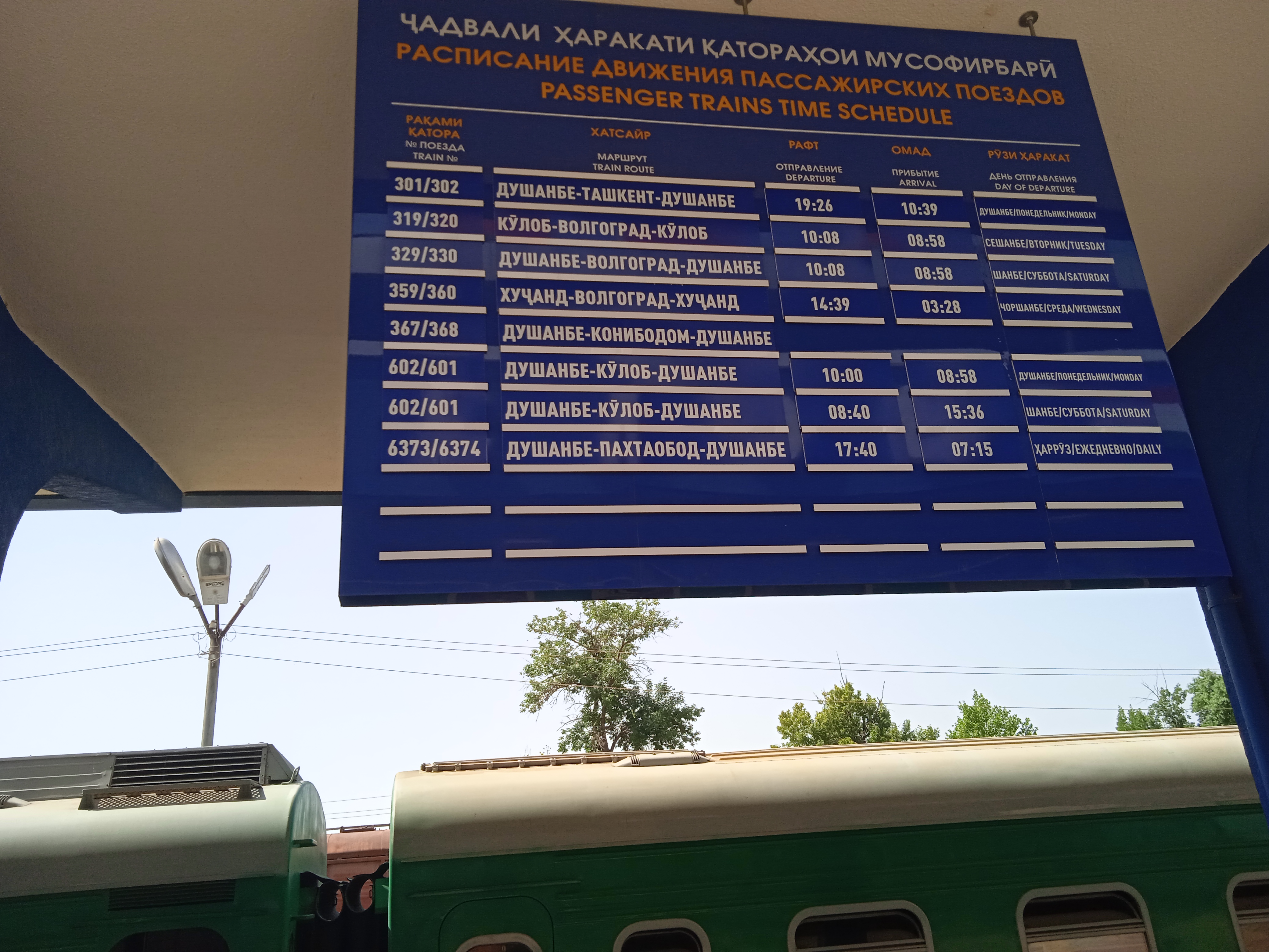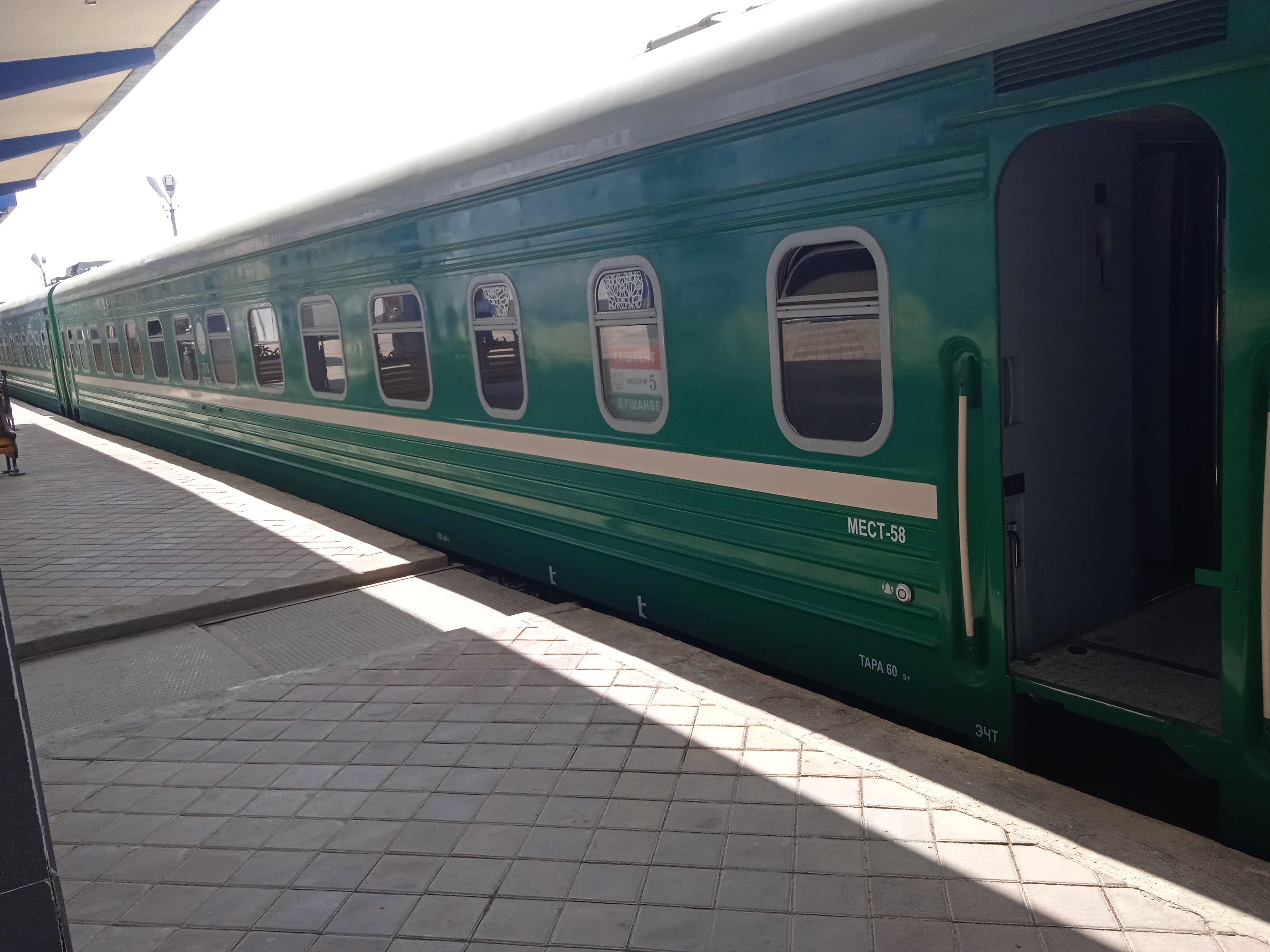 Состав полный, почти 100 %. Небольшая посадка и высадка по пути. Приехав в Самарканд у нас было около трех часов до поезда в Душанбе, как мы предполагали, судя по расписанию. Но однако, оно в этот день изменилось на 40 минут раньше и мы чудом узнали, что наш поезд уже стоит на 3 пути и через 10 минут отправляется.