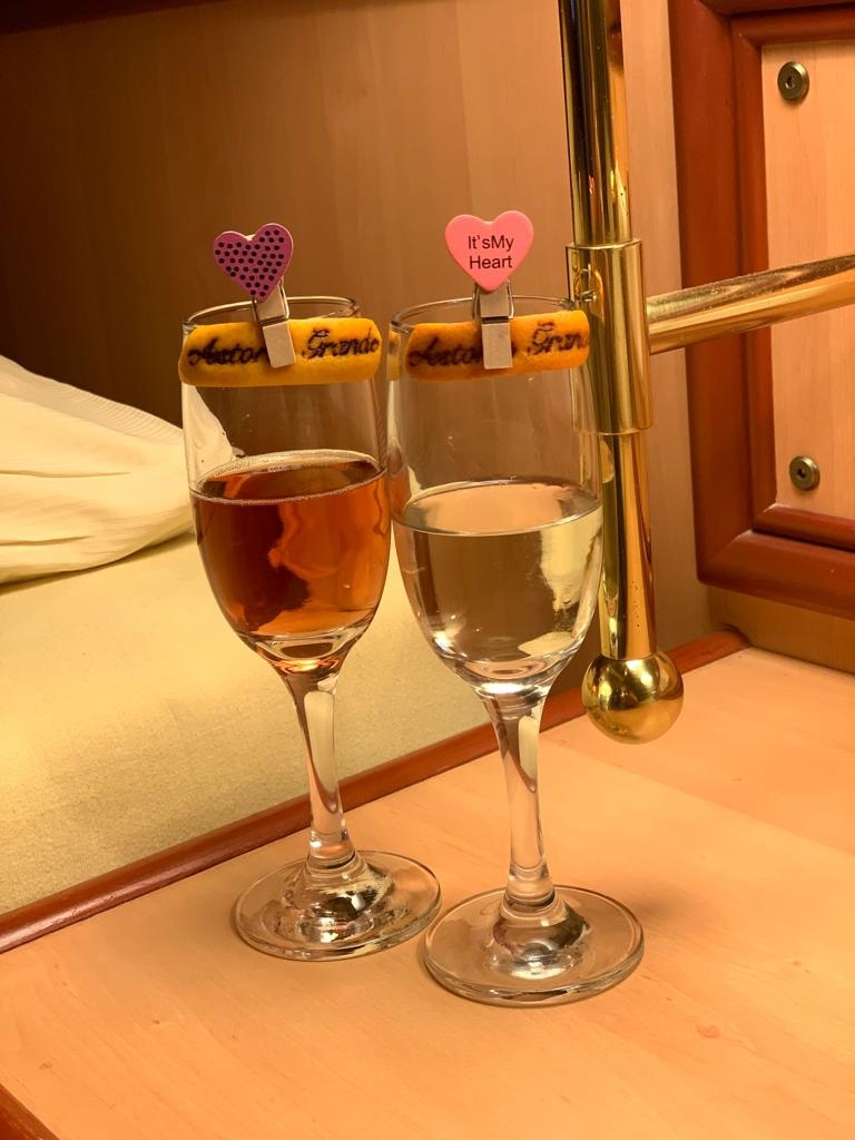 Также на входе угощают забавным велкам-дринком, ну а сама каюта с иллюминатором и расположена в носовой части корабля.