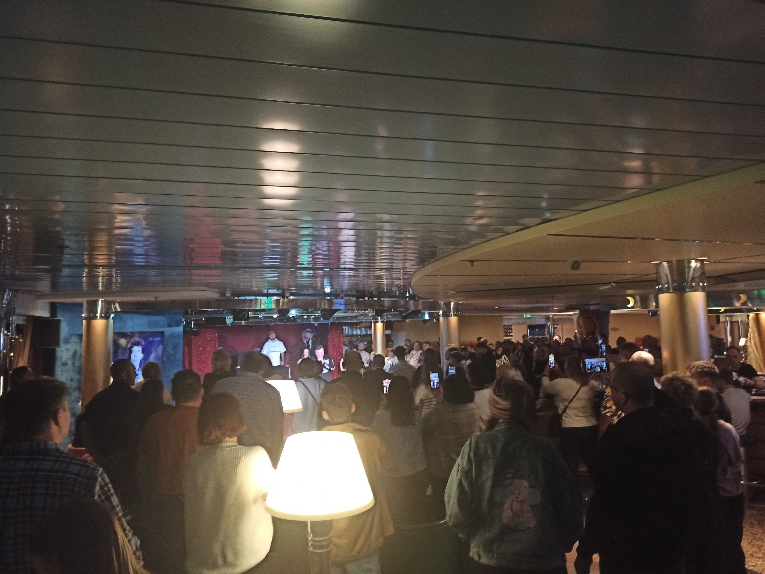 В вечерней программе круиза был караоке-баттл с командой КВН Уездный город. Среди пассажиров был и участник военной операции на территории быв. Украины. Он пел песню "Офицеры", которую весь зал подпевал стоя.